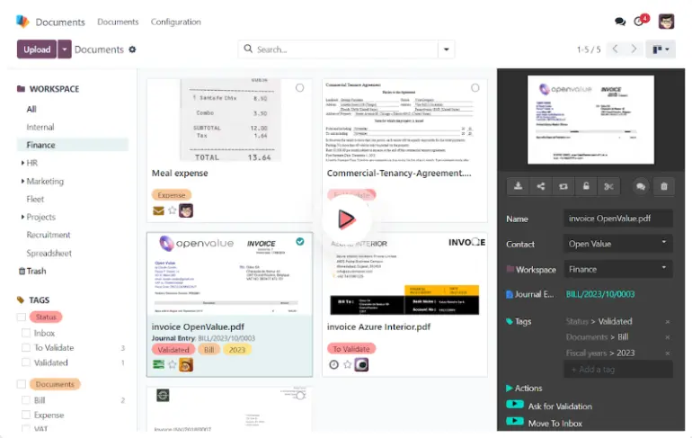 Odoo Documents allows you to manage files online from a single place: no more scanning contracts, manual bill recording, or long approval processes.